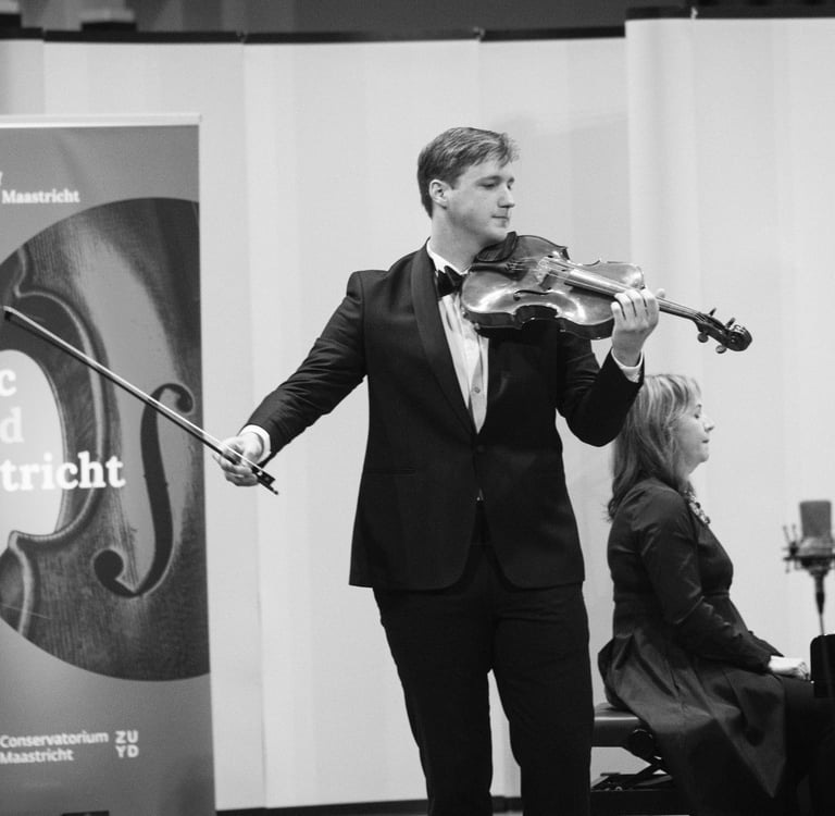 Oleksandr began his musical training on violin and piano, later developing his passion for composing and conducting. He graduated with first-class honours in viola from Glier Kyiv Municipal Academy of Music in 2022, then earned his master’s degree cum laude in 2023 at Conservatorium Maastricht, studying with professor Michael Kugel. In 2024, he completed a master’s degree in composition with first-class honours under Evgen Stankovych at the Ukrainian National Tchaikovsky Academy of Music. He earned a second master’s degree cum laude from Conservatory Maastricht in 2025, studying with Julia Dinerstein.